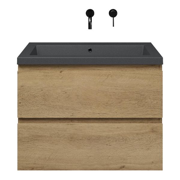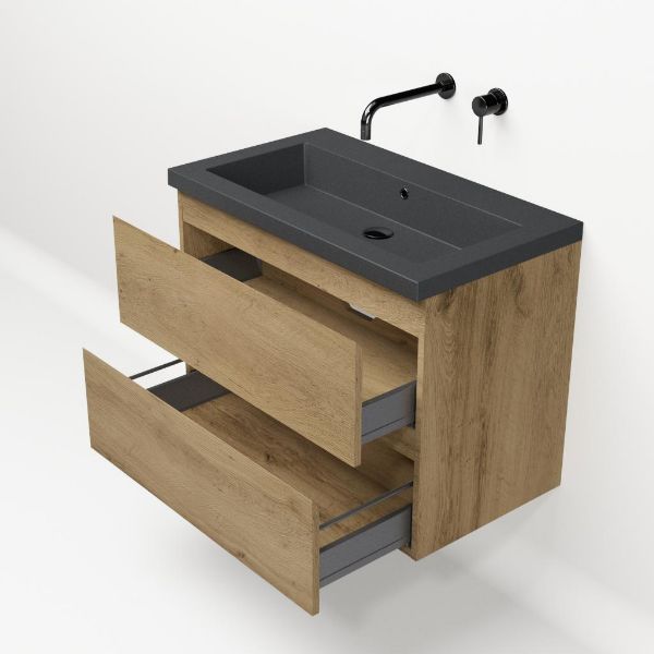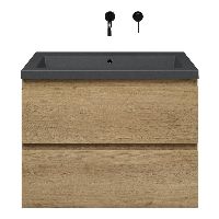 | | Bellanti Gisella/Esta-Q badmeubel 80x46 2 softclose laden warm eiken greeploos quartz wastafel mat grijs zonder kraangaten |