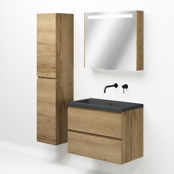 Greeploos badkamermeubel in de kleur eiken warm is 80 cm breed. De wastafel is vervaardig in quartz en heeft de kleur grijs mat quartz. Dit badkamermeubel met deze wastafel is leverbaar tussen de 60 cm t/m 200 cm