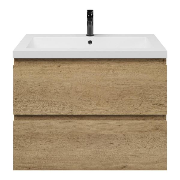 Greeploos badkamermeubel in de kleur eiken warm is 80 cm breed. De wastafel is vervaardig in quartz en heeft de kleur wit mat quartz. Dit badkamermeubel met deze wastafel is leverbaar tussen de 60 cm t/m 200 cm