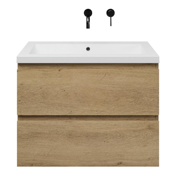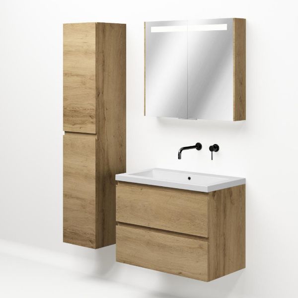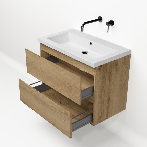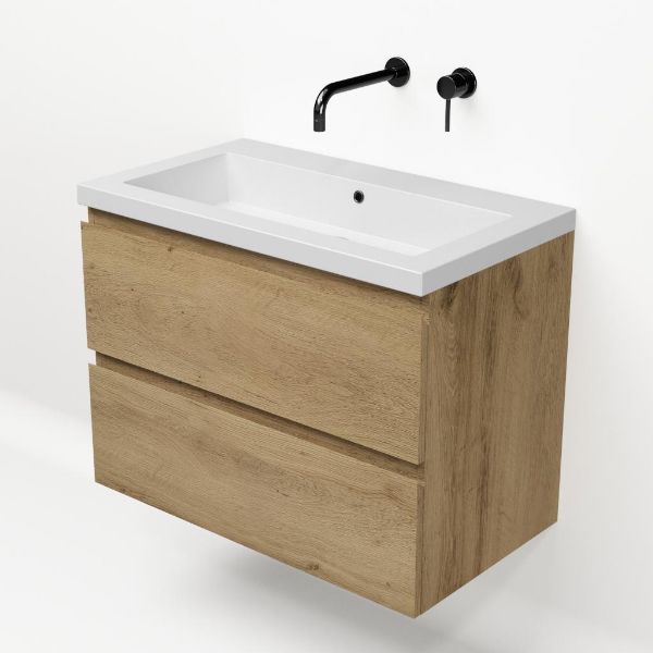 | | Bellanti Gisella/Esta-Q badmeubel 80x46 2 softclose laden warm eiken greeploos quartz wastafel mat wit zonder kraangaten |
