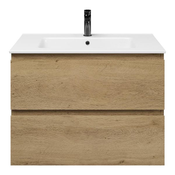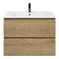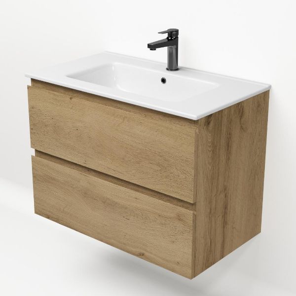 Greeploos badkamermeubel in de kleur eiken warm is 80 cm breed. De wastafel is vervaardig in keramiek en heeft de kleur wit keramiek. Dit badkamermeubel met deze wastafel is leverbaar tussen de 60 cm t/m 120 cm