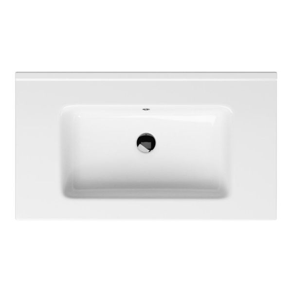 Greeploos badkamermeubel in de kleur eiken warm is 80 cm breed. De wastafel is vervaardig in keramiek en heeft de kleur wit keramiek. Dit badkamermeubel met deze wastafel is leverbaar tussen de 60 cm t/m 120 cm