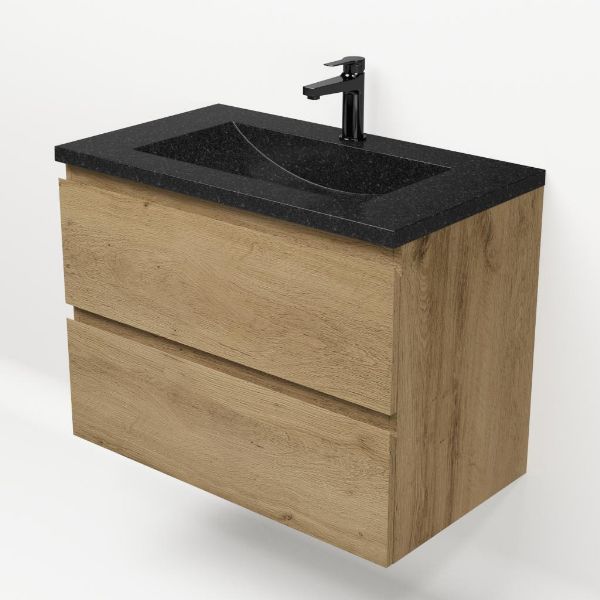 | | Bellanti Gisella/Faro Stone badmeubel 80x46 2 softclose laden warm eiken greeploos natuursteen wastafel blue stone met 1 kraangat |