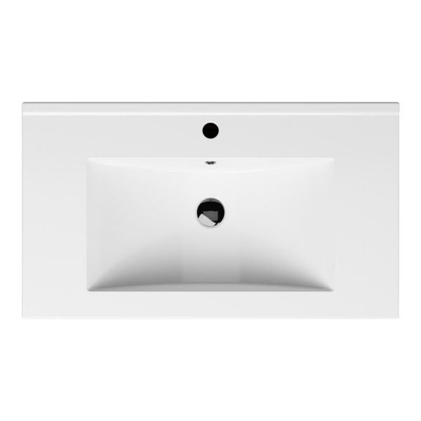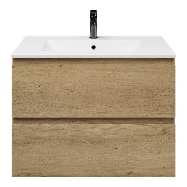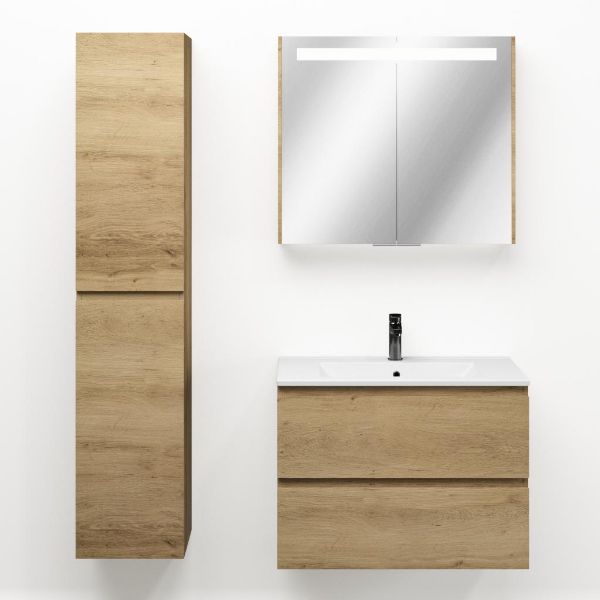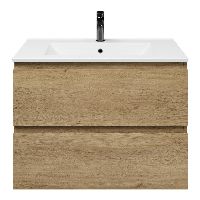 Greeploos badkamermeubel in de kleur eiken warm is 80 cm breed. De wastafel is vervaardig in keramiek en heeft de kleur wit keramiek. Dit badkamermeubel met deze wastafel is leverbaar tussen de 60 cm t/m 120 cm