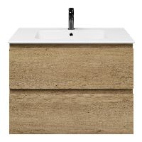Greeploos badkamermeubel in de kleur eiken warm is 80 cm breed. De wastafel is vervaardig in keramiek en heeft de kleur wit keramiek. Dit badkamermeubel met deze wastafel is leverbaar tussen de 60 cm t/m 120 cm