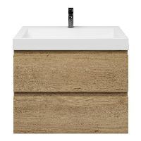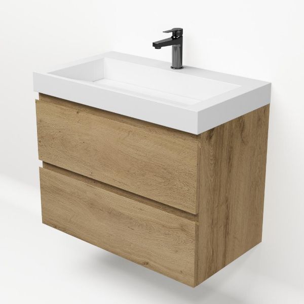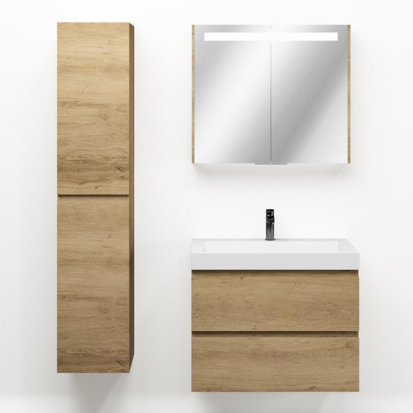 Greeploos badkamermeubel in de kleur eiken warm is 80 cm breed. De wastafel is vervaardig in polystone en heeft de kleur wit. Dit badkamermeubel met deze wastafel is leverbaar tussen de 60 cm t/m 140 cm