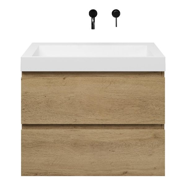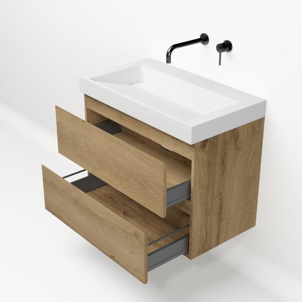 Greeploos badkamermeubel in de kleur eiken warm is 80 cm breed. De wastafel is vervaardig in polystone en heeft de kleur wit. Dit badkamermeubel met deze wastafel is leverbaar tussen de 60 cm t/m 140 cm