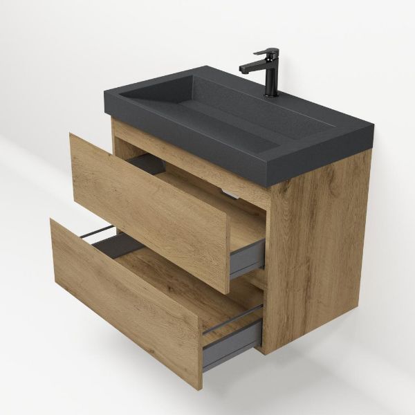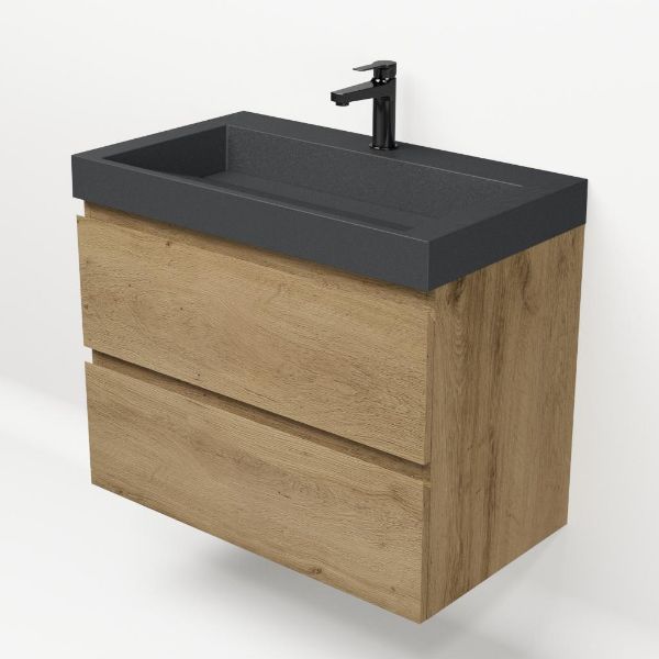 | | Bellanti Gisella/Renzo-q badmeubel 80x46 2 softclose laden warm eiken greeploos quartz wastafel mat grijs met 1 kraangat |