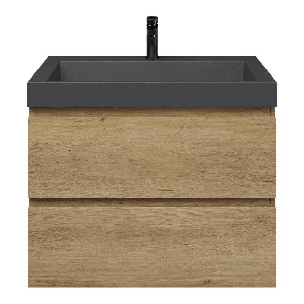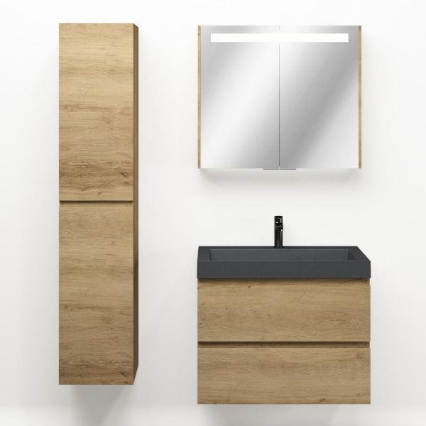 Greeploos badkamermeubel in de kleur eiken warm is 80 cm breed. De wastafel is vervaardig in quartz en heeft de kleur grijs mat quartz. Dit badkamermeubel met deze wastafel is leverbaar tussen de 60 cm t/m 140 cm