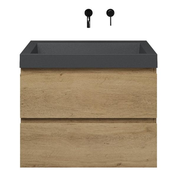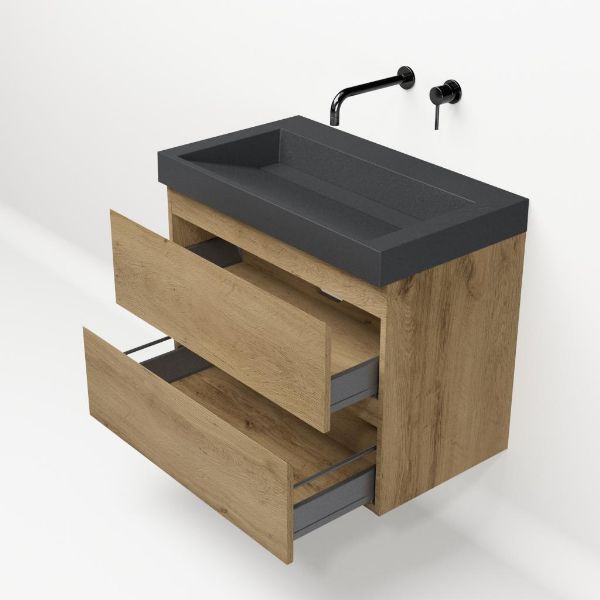 | | Bellanti Gisella/Renzo-q badmeubel 80x46 2 softclose laden warm eiken greeploos quartz wastafel mat grijs zonder kraangaten |