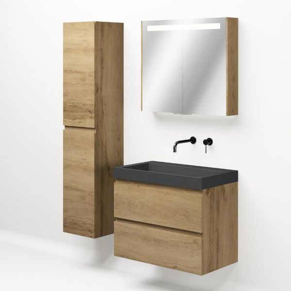 Greeploos badkamermeubel in de kleur eiken warm is 80 cm breed. De wastafel is vervaardig in quartz en heeft de kleur grijs mat quartz. Dit badkamermeubel met deze wastafel is leverbaar tussen de 60 cm t/m 140 cm