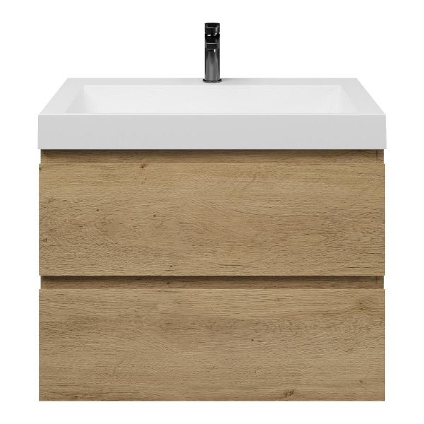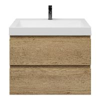 Greeploos badkamermeubel in de kleur eiken warm is 80 cm breed. De wastafel is vervaardig in quartz en heeft de kleur wit mat keramiek. Dit badkamermeubel met deze wastafel is leverbaar tussen de 60 cm t/m 140 cm