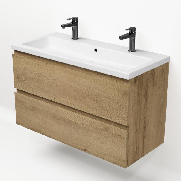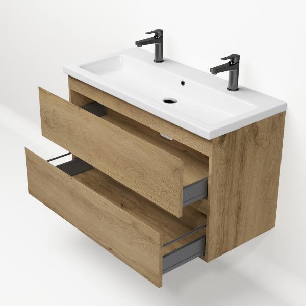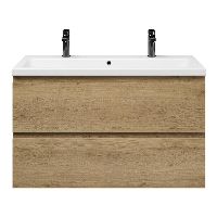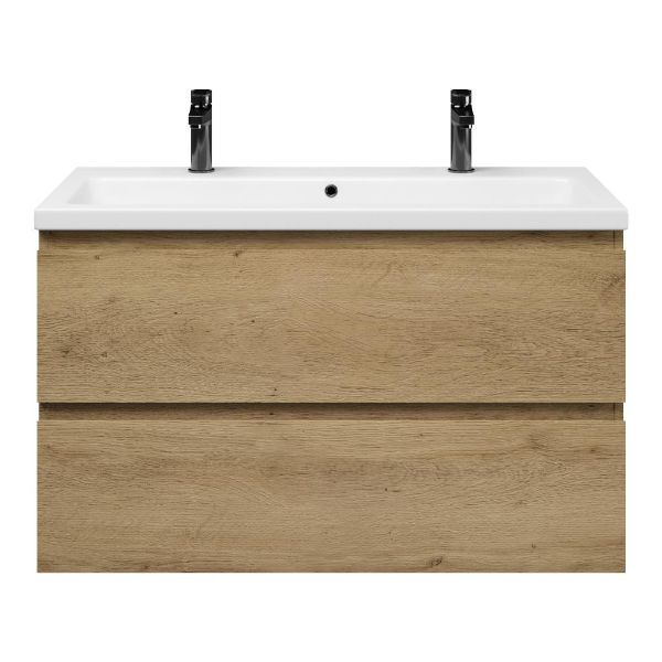 | | Bellanti Gisella/Amelia badmeubel 100x46 2 softclose laden warm eiken greeploos keramische wastafel wit glans met 2 kraangaten |