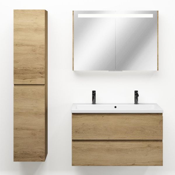 Greeploos badkamermeubel in de kleur eiken warm is 100 cm breed. De wastafel is vervaardig in keramiek en heeft de kleur wit keramiek. Dit badkamermeubel met deze wastafel is leverbaar tussen de 60 cm t/m 120 cm