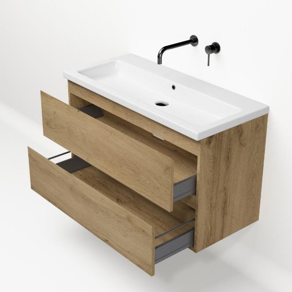 | Bellanti Gisella/Amelia badmeubel 100x46 2 softclose laden warm eiken greeploos keramische wastafel wit glans zonder kraangaten |