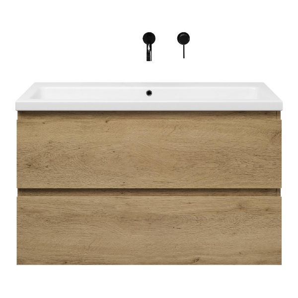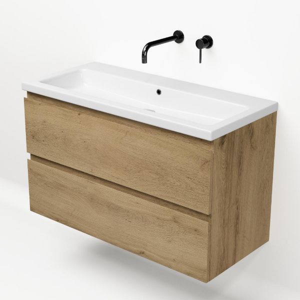 Greeploos badkamermeubel in de kleur eiken warm is 100 cm breed. De wastafel is vervaardig in keramiek en heeft de kleur wit keramiek. Dit badkamermeubel met deze wastafel is leverbaar tussen de 60 cm t/m 120 cm