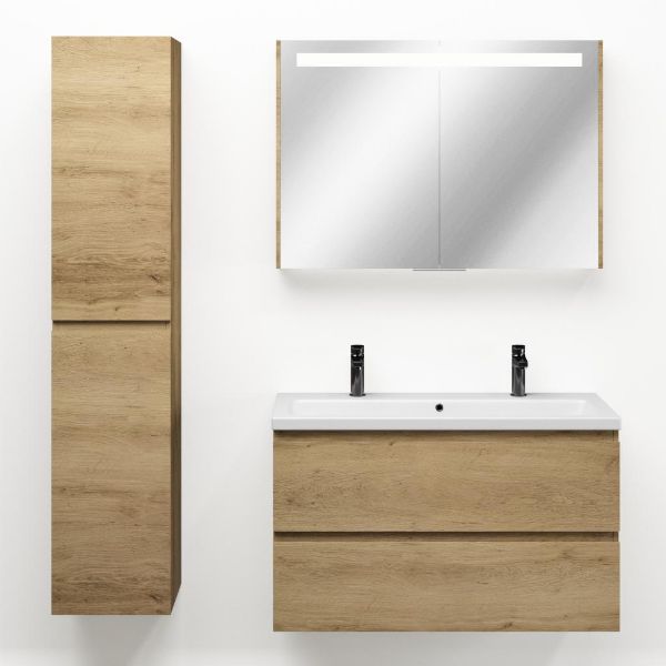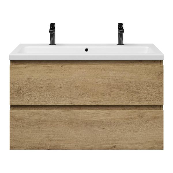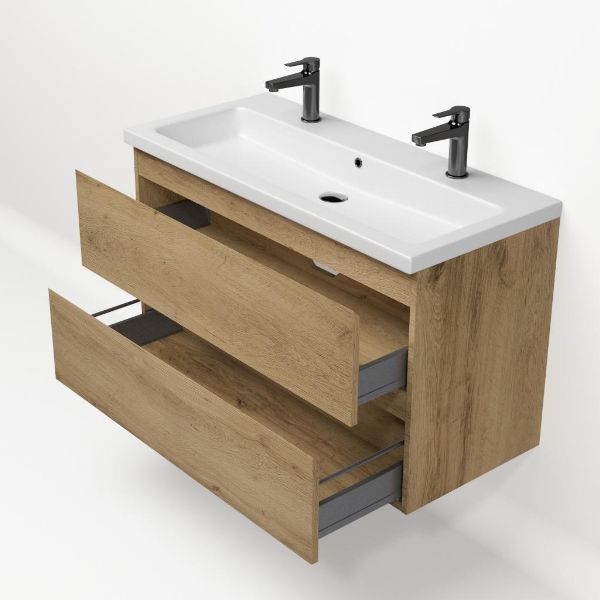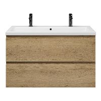 | | Bellanti Gisella/Amelia badmeubel 100x46 2 softclose laden warm eiken greeploos keramische wastafel wit mat met 2 kraangaten |