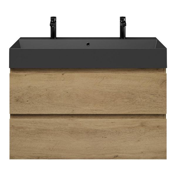 Bellanti Gisella/Azzurra badmeubel 100x46 2 softclose laden warm eiken greeploos keramische wastafel antraciet mat met 2 kraangaten