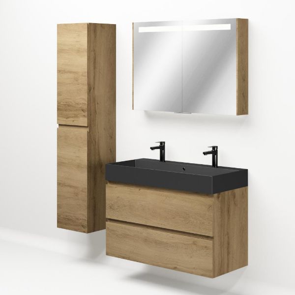 Greeploos badkamermeubel in de kleur eiken warm is 100 cm breed.  De wastafel is vervaardig in keramiek en heeft de kleur antraciet mat keramiek. Dit badkamermeubel met deze wastafel is leverbaar tussen de 60 cm t/m 160 cm