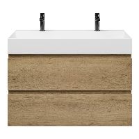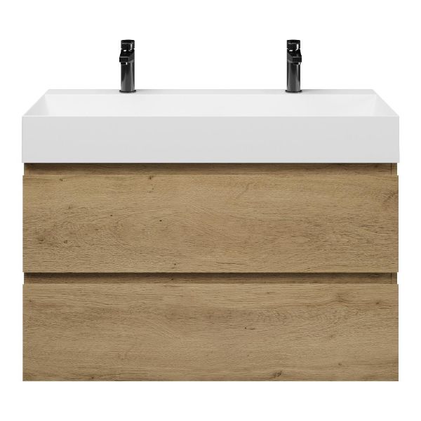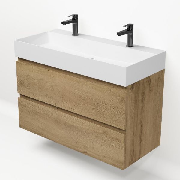 | | Bellanti Gisella/Azzurra badmeubel 100x46 2 softclose laden warm eiken greeploos keramische wastafel wit glans met 2 kraangaten |