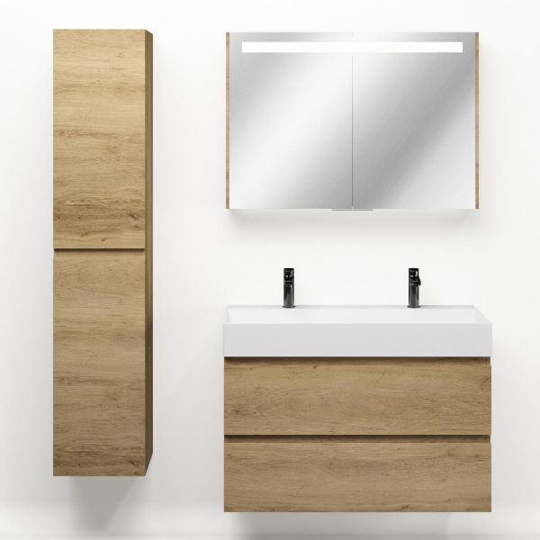 Greeploos badkamermeubel in de kleur eiken warm is 100 cm breed. De wastafel is vervaardig in keramiek en heeft de kleur wit keramiek. Dit badkamermeubel met deze wastafel is leverbaar tussen de 60 cm t/m 160 cm