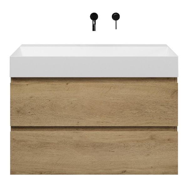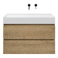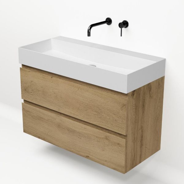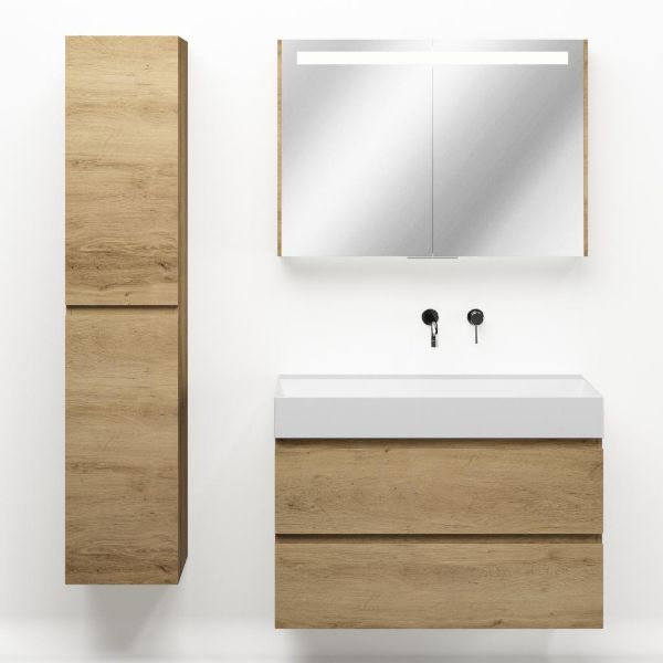 Greeploos badkamermeubel in de kleur eiken warm is 100 cm breed. De wastafel is vervaardig in keramiek en heeft de kleur wit mat keramiek. Dit badkamermeubel met deze wastafel is leverbaar tussen de 60 cm t/m 160 cm