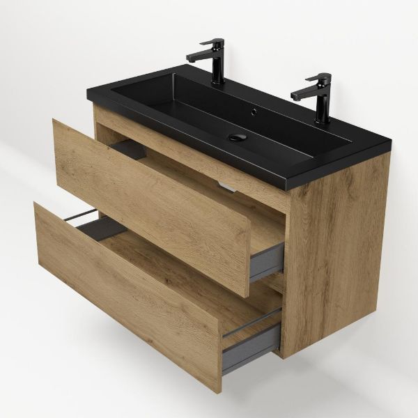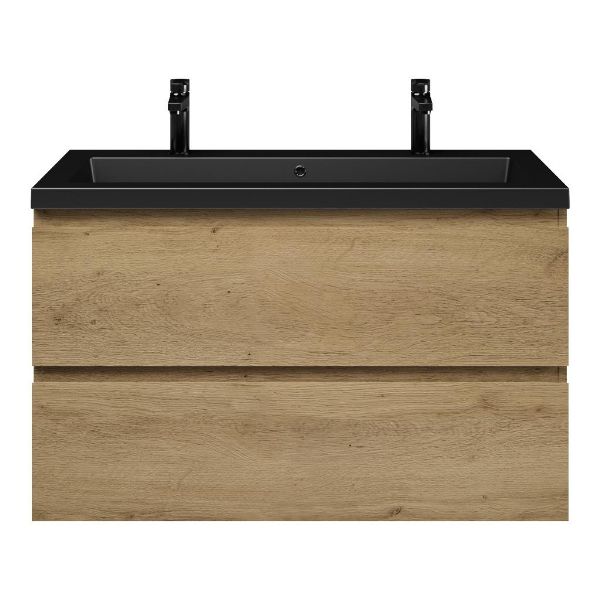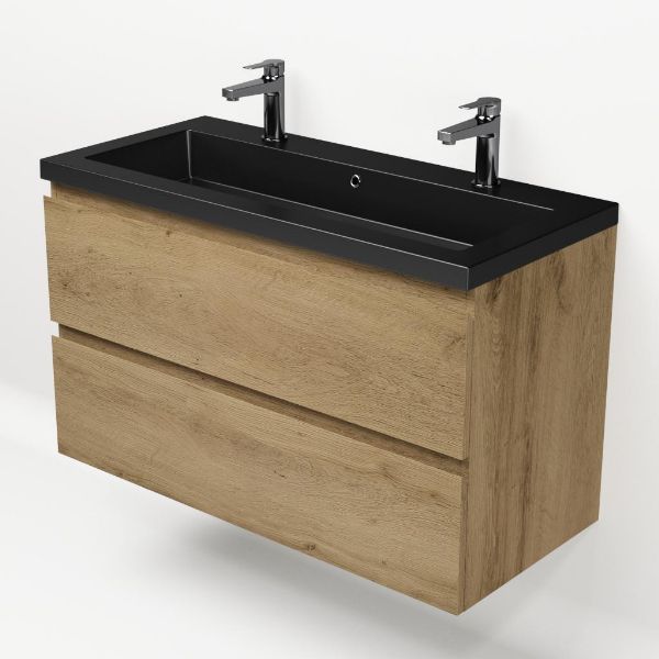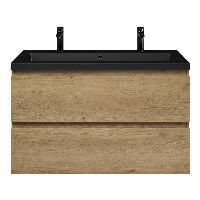 | | Bellanti Gisella/Esta badmeubel 100x46 2 softclose laden warm eiken greeploos polystone wastafel mat zwart met 2 kraangaten |