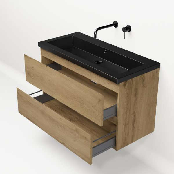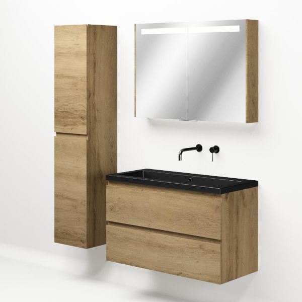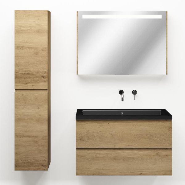 Greeploos badkamermeubel in de kleur eiken warm is 100 cm breed. De wastafel is vervaardig in polystone en heeft de kleur zwart mat. Dit badkamermeubel met deze wastafel is leverbaar tussen de 60 cm t/m 200 cm