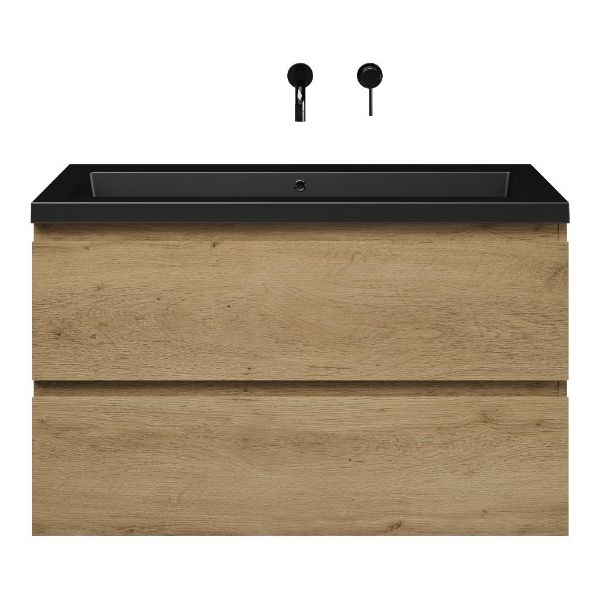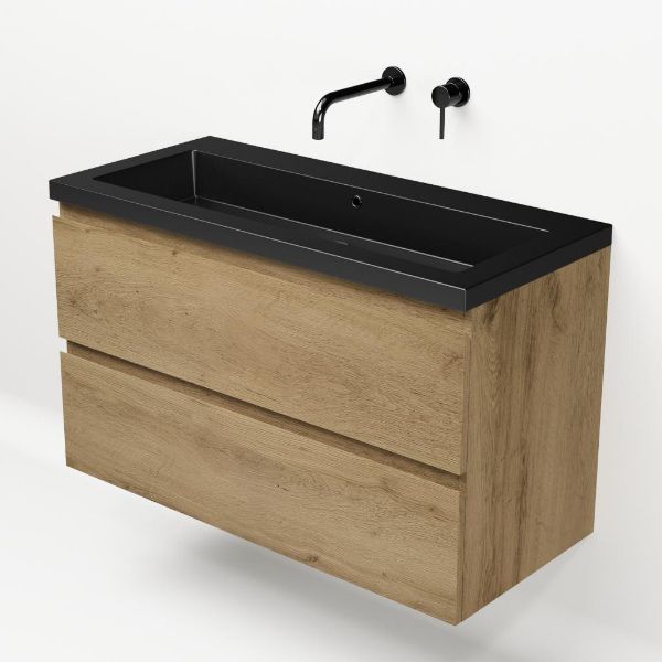 | | Bellanti Gisella/Esta badmeubel 100x46 2 softclose laden warm eiken greeploos polystone wastafel mat zwart zonder kraangaten |