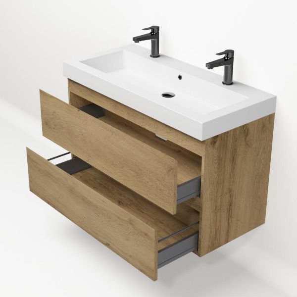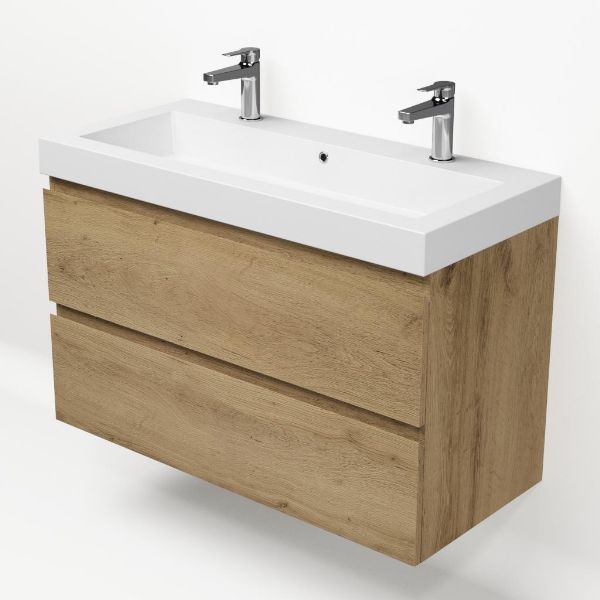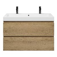 | | Bellanti Gisella/Esta badmeubel 100x46 2 softclose laden warm eiken greeploos polystone wastafel wit met 2 kraangaten |