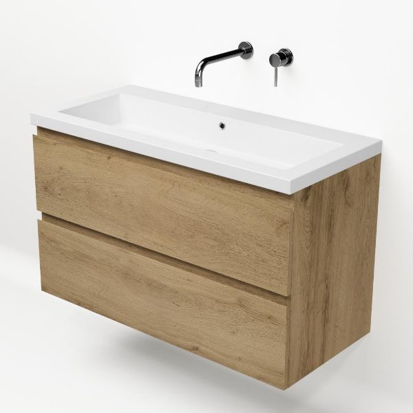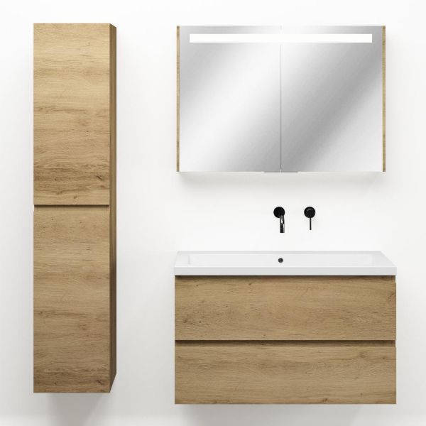 Greeploos badkamermeubel in de kleur eiken warm is 100 cm breed. De wastafel is vervaardig in polystone en heeft de kleur wit. Dit badkamermeubel met deze wastafel is leverbaar tussen de 60 cm t/m 200 cm