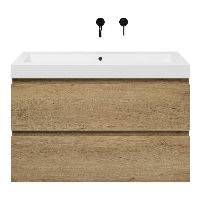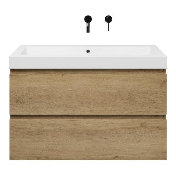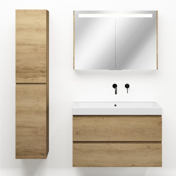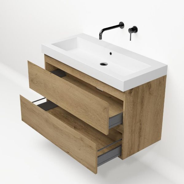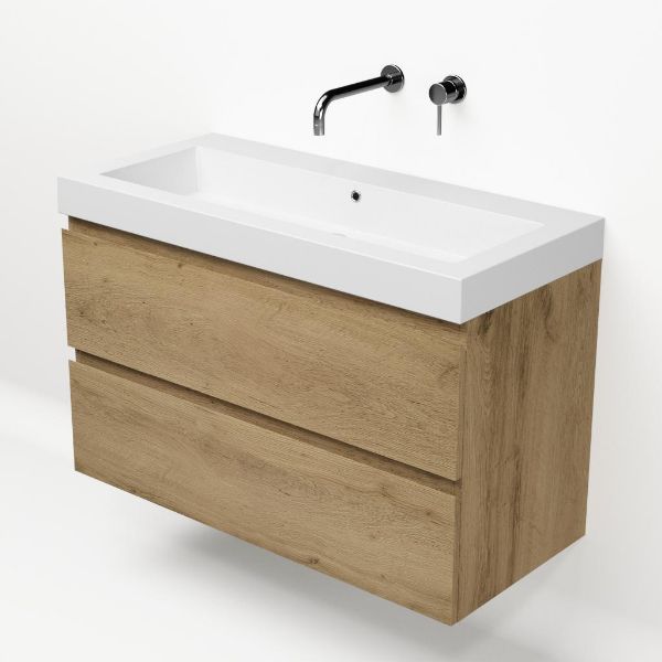 Greeploos badkamermeubel in de kleur eiken warm is 100 cm breed.  De wastafel is vervaardig in polystone en heeft de kleur wit. Dit badkamermeubel met deze wastafel is leverbaar tussen de 60 cm t/m 200 cm