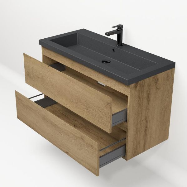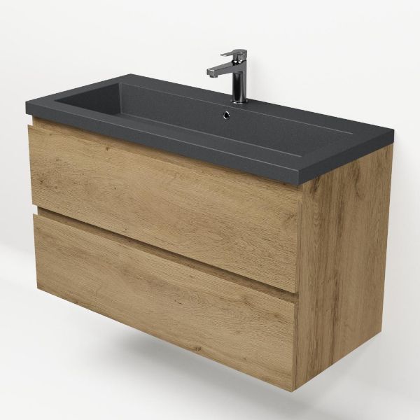 | | Bellanti Gisella/Esta-Q badmeubel 100x46 2 softclose laden warm eiken greeploos quartz wastafel mat grijs met 1 kraangat |