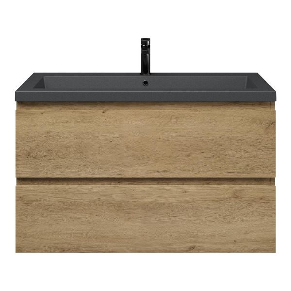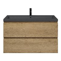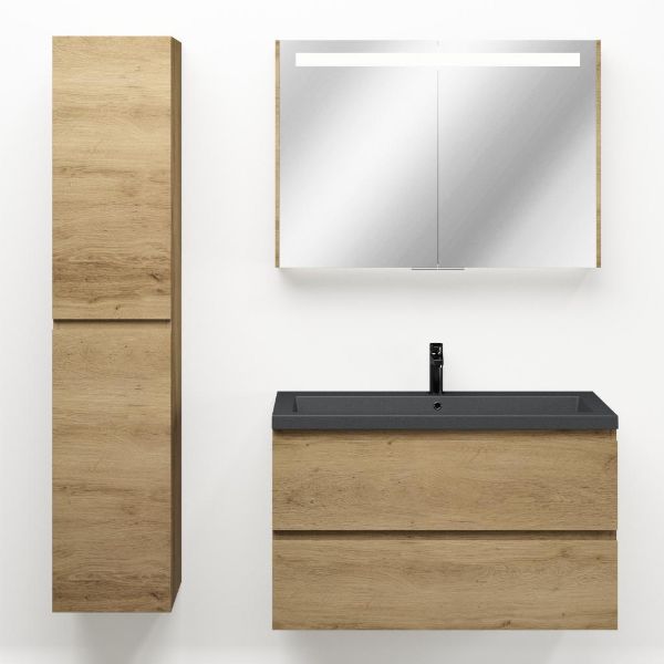 Greeploos badkamermeubel in de kleur eiken warm is 100 cm breed. De wastafel is vervaardig in quartz en heeft de kleur grijs mat quartz. Dit badkamermeubel met deze wastafel is leverbaar tussen de 60 cm t/m 200 cm