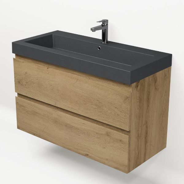 | | Bellanti Gisella/Esta-Q badmeubel 100x46 2 softclose laden warm eiken greeploos quartz wastafel mat grijs met 1 kraangat |