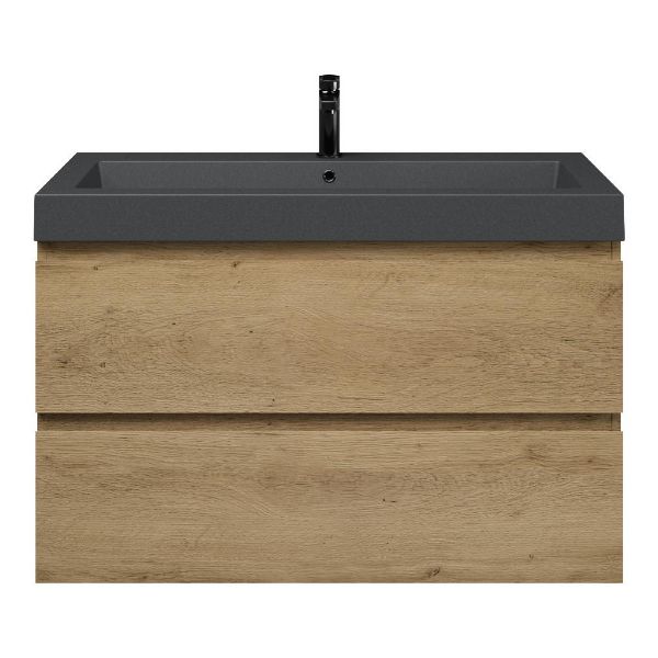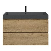 Greeploos badkamermeubel in de kleur eiken warm is 100 cm breed. De wastafel is vervaardig in quartz en heeft de kleur grijs mat quartz. Dit badkamermeubel met deze wastafel is leverbaar tussen de 60 cm t/m 200 cm