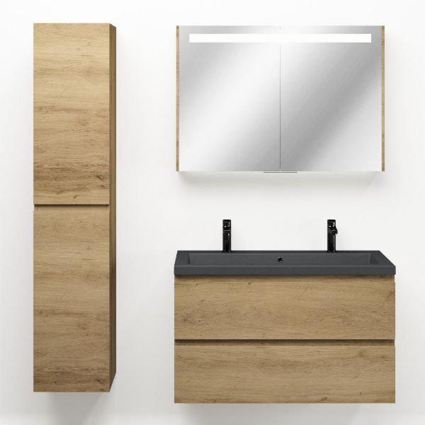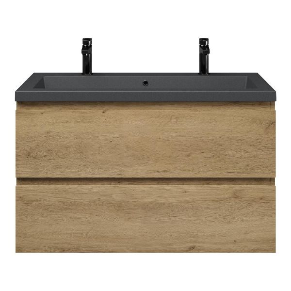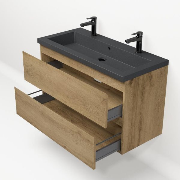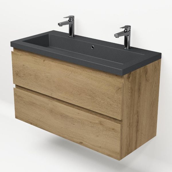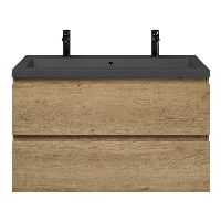 | | Bellanti Gisella/Esta-Q badmeubel 100x46 2 softclose laden warm eiken greeploos quartz wastafel mat grijs met 2 kraangaten |