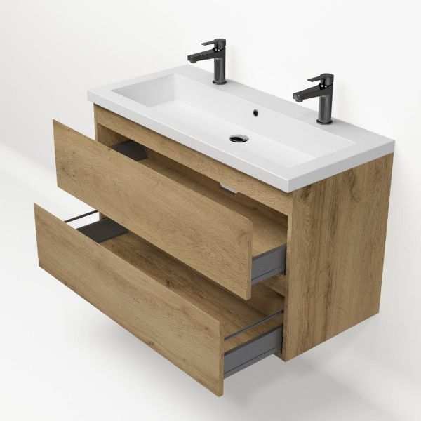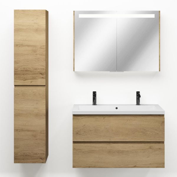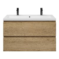 | | Bellanti Gisella/Esta-Q badmeubel 100x46 2 softclose laden warm eiken greeploos wastafel mat wit met 2 kraangaten |