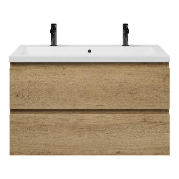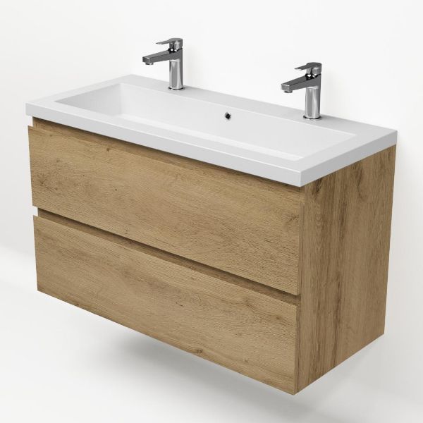 | Bellanti Gisella/Esta-Q badmeubel 100x46 2 softclose laden warm eiken greeploos wastafel mat wit met 2 kraangaten |