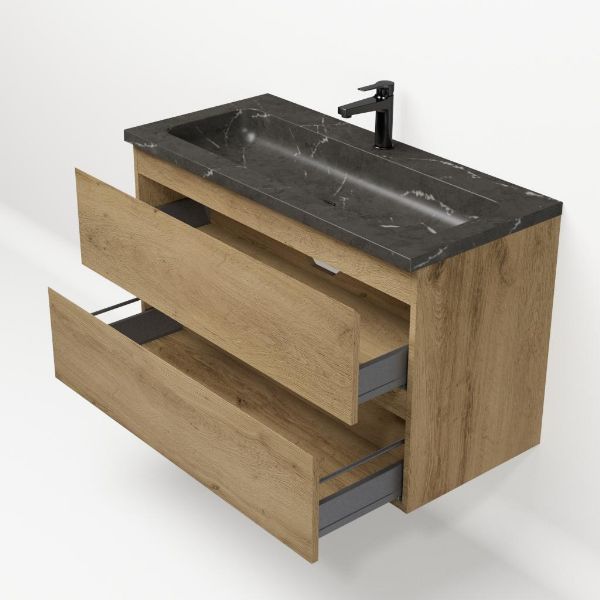 | | Bellanti Gisella/Square badmeubel 100x46 2 softclose laden warm eiken greeploos natuursteen wastafel blue stone met 1 kraangat |