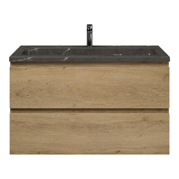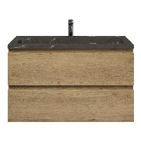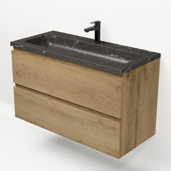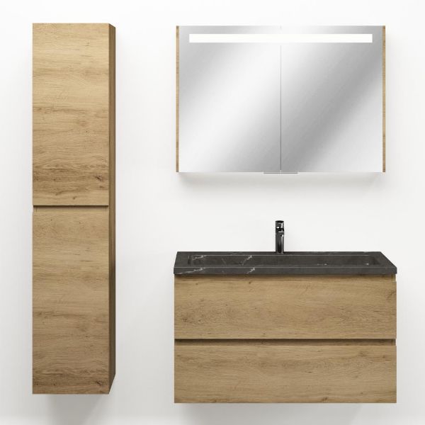 Greeploos badkamermeubel in de kleur eiken warm is 100 cm breed. De wastafel is vervaardig in natuursteen en heeft de kleur blue stone. Dit badkamermeubel met deze wastafel is leverbaar tussen de 60 cm t/m 120 cm