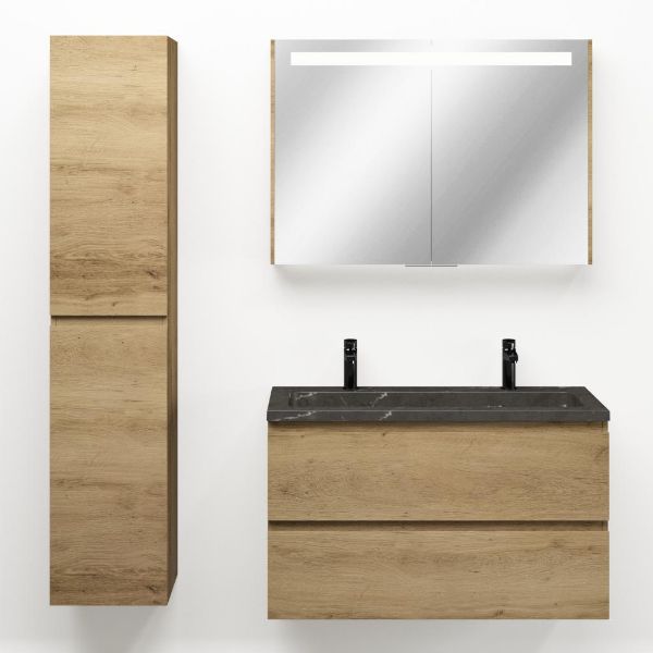 Greeploos badkamermeubel in de kleur eiken warm is 100 cm breed. De wastafel is vervaardig in natuursteen en heeft de kleur blue stone. Dit badkamermeubel met deze wastafel is leverbaar tussen de 60 cm t/m 120 cm