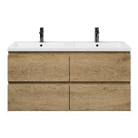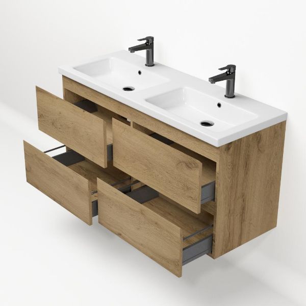 | | Bellanti Gisella/Amelia badmeubel 120x46 4 softclose laden warm eiken greeploos keramische wastafel dubbel wit glans met 2 kraangaten |