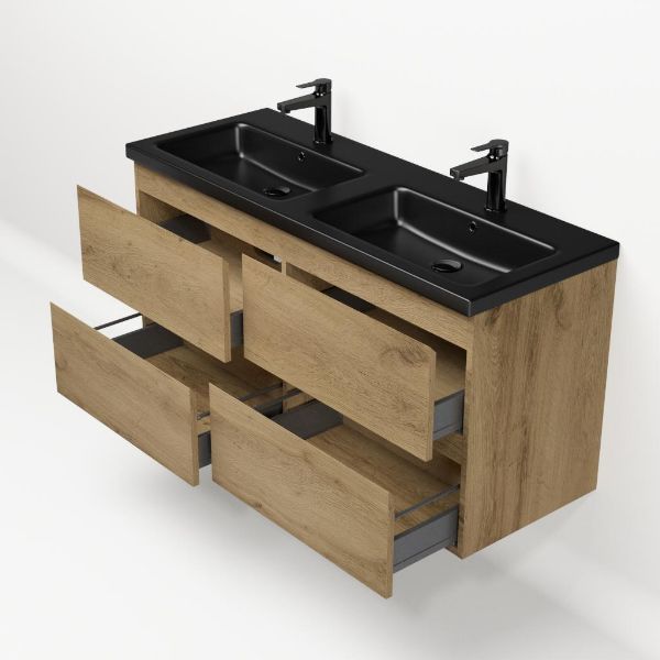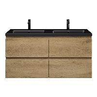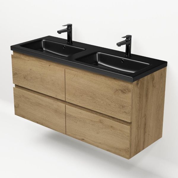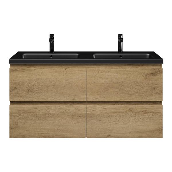 | | Bellanti Gisella/Amelia badmeubel 120x46 4 softclose laden warm eiken greeploos keramische wastafel dubbel zwart mat met 2 kraangaten |