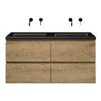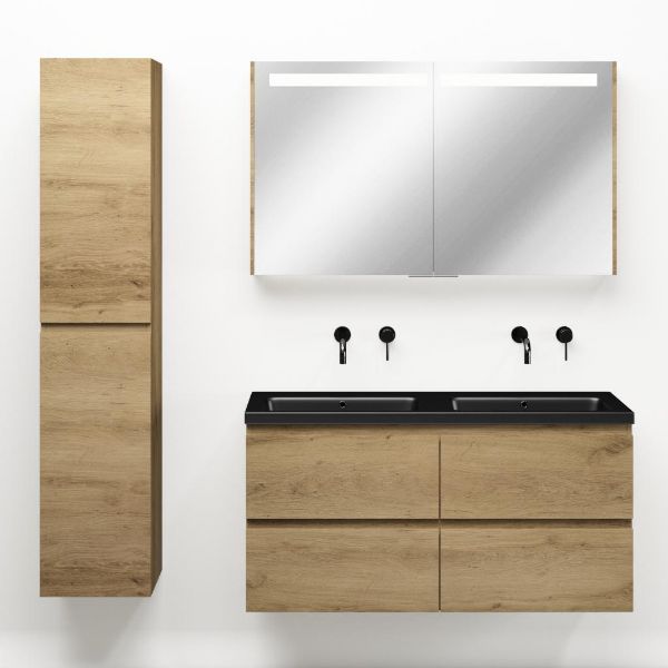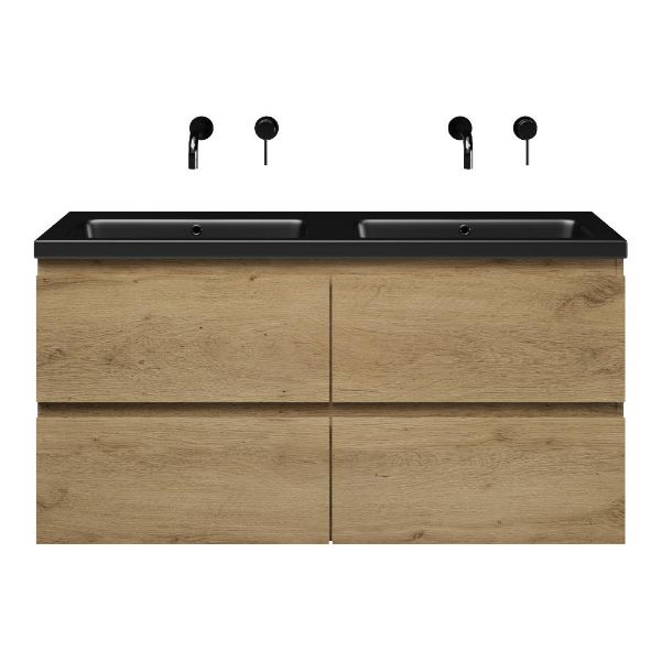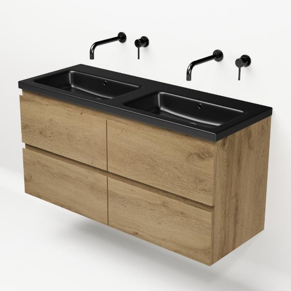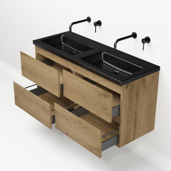 | | Bellanti Gisella/Amelia badmeubel 120x46 4 softclose laden warm eiken greeploos keramische wastafel dubbel zwart mat zonder kraangaten |