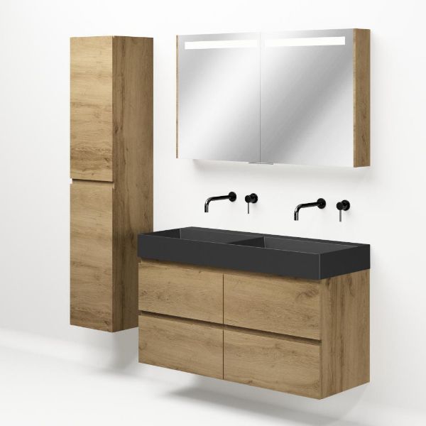 Greeploos badkamermeubel in de kleur eiken warm is 120 cm breed. De wastafel is vervaardig in keramiek en heeft de kleur antraciet mat keramiek. Dit badkamermeubel met deze wastafel is leverbaar tussen de 60 cm t/m 160 cm