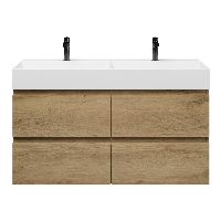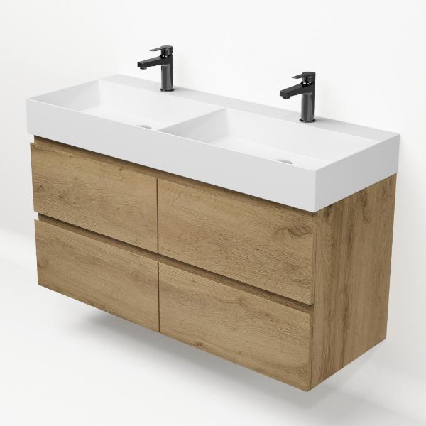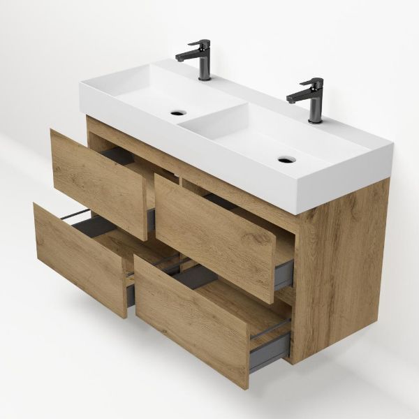 | | Bellanti Gisella/Azzurra badmeubel 120x46 4 softclose laden warm eiken greeploos keramische wastafel dubbel wit glans met 2 kraangaten |