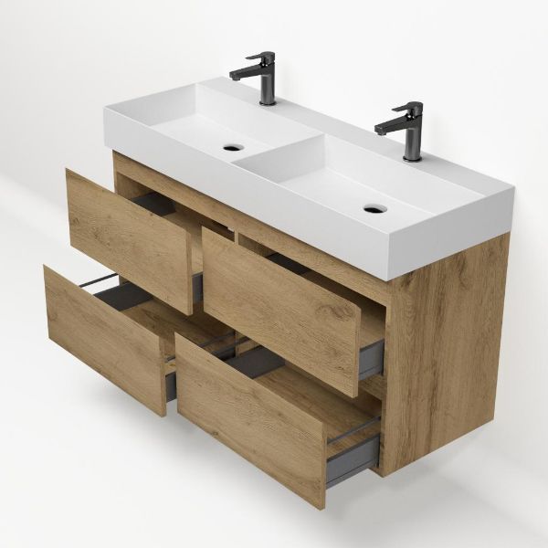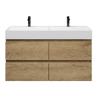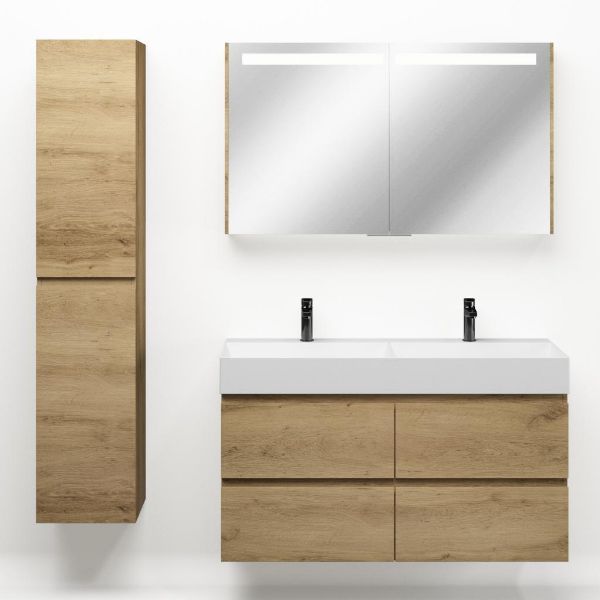 | | Bellanti Gisella/Azzurra badmeubel 120x46 4 softclose laden warm eiken greeploos keramische wastafel dubbel wit mat met 2 kraangaten |