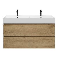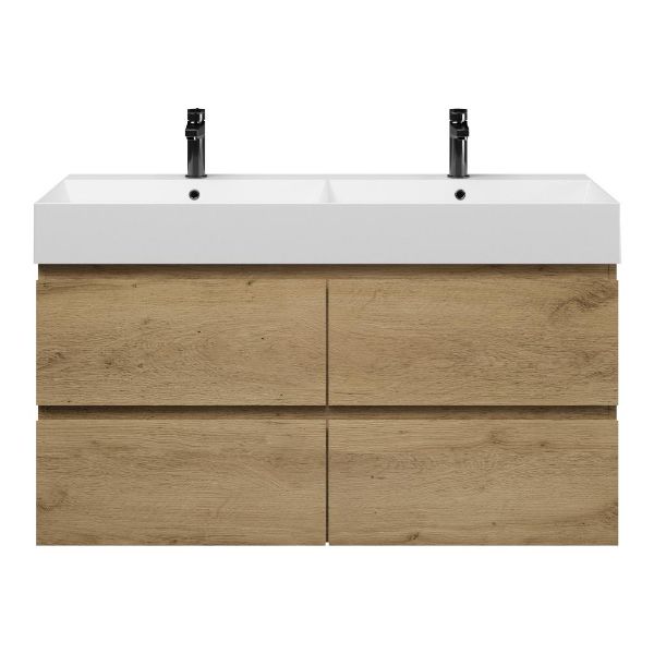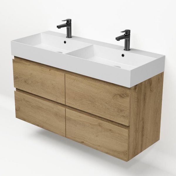 Bellanti Gisella/Azzurra badmeubel 120x46 4 softclose laden warm eiken greeploos keramische wastafel dubbel wit mat met 2 kraangaten