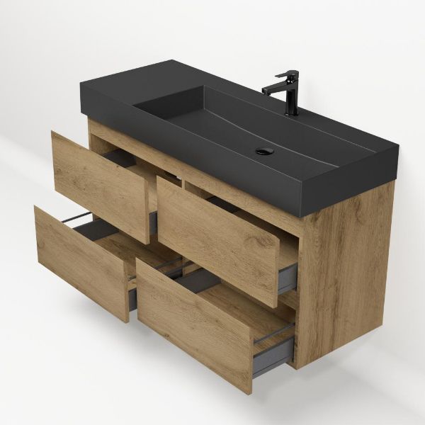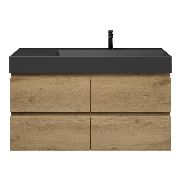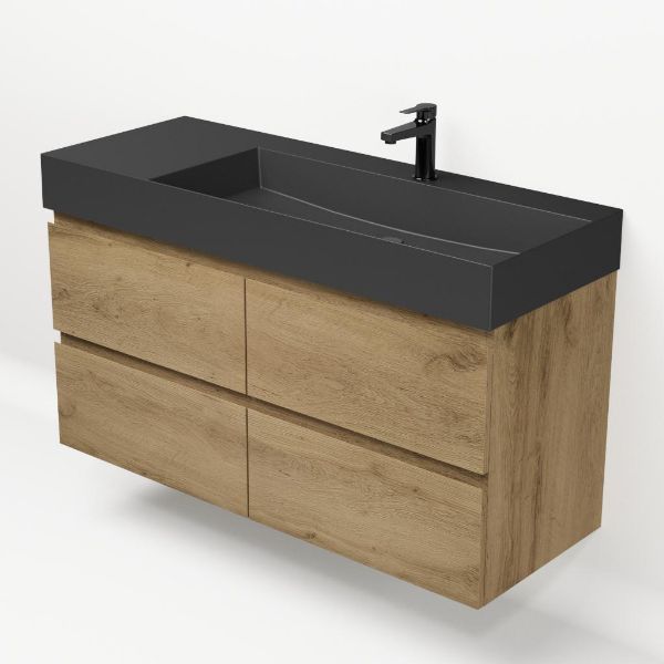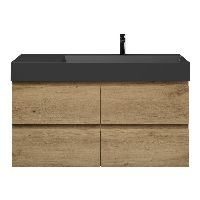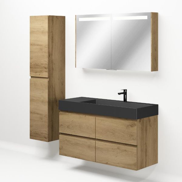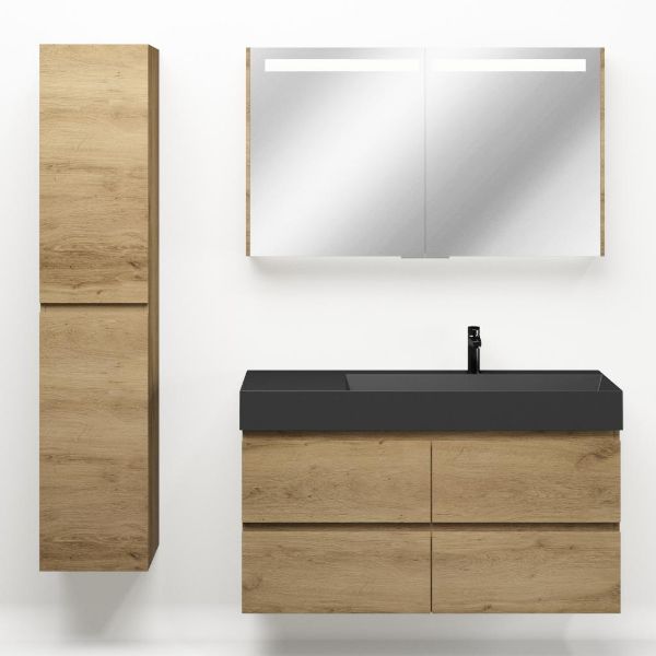 Greeploos badkamermeubel in de kleur eiken warm is 120 cm breed. De wastafel is vervaardig in keramiek en heeft de kleur antraciet mat keramiek. Dit badkamermeubel met deze wastafel is leverbaar tussen de 60 cm t/m 160 cm